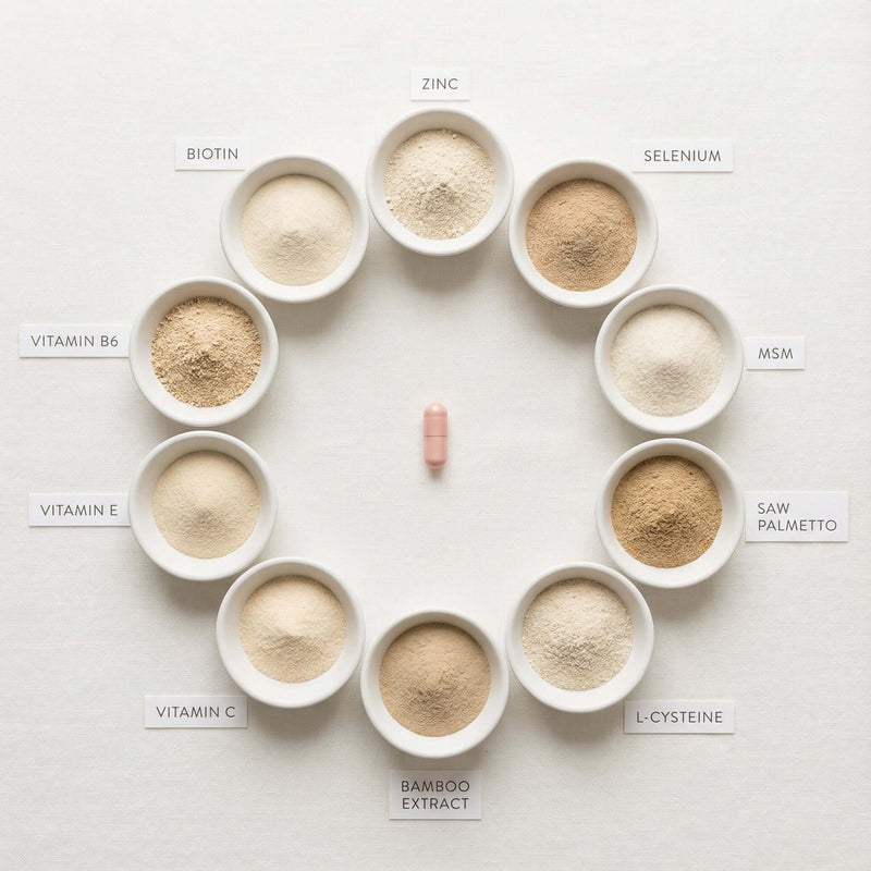 GrowMe is formulated with targeted vitamins, minerals and amino acids that support hair health during hormonal and metabolic change.