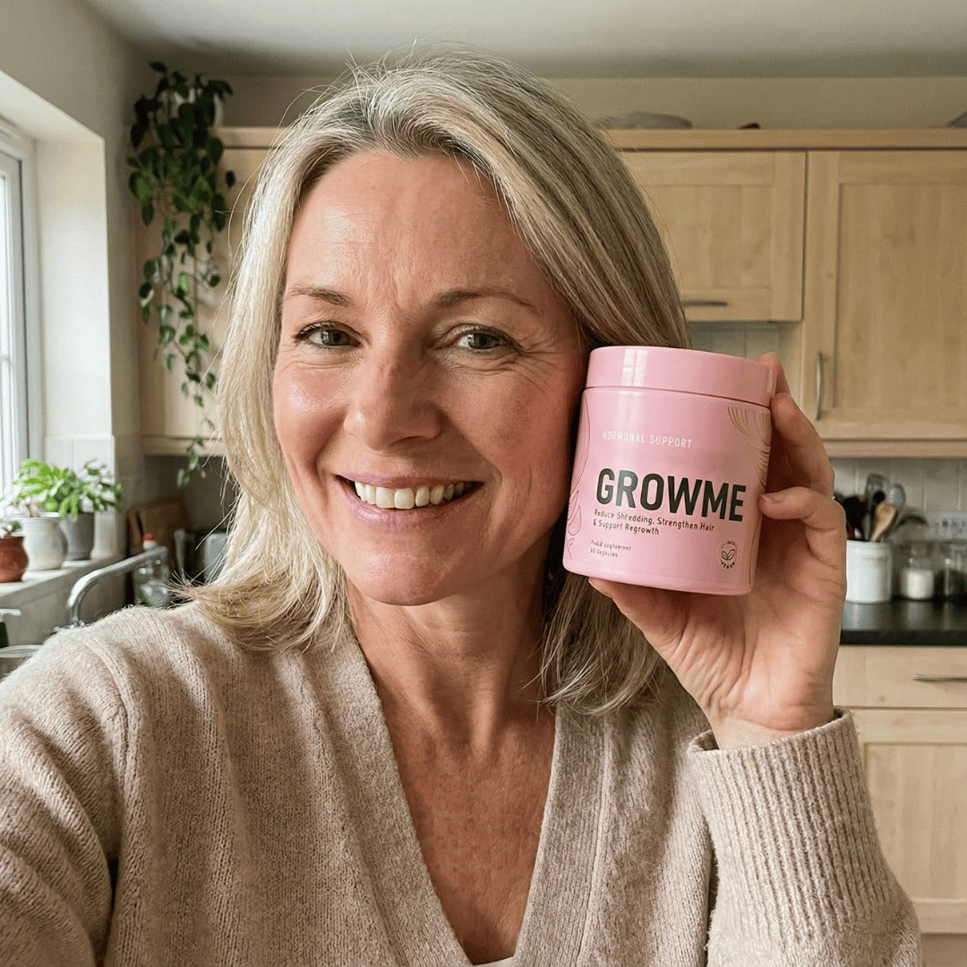GrowMe works from within to support the hair cycle during hormonal and metabolic change. Key nutrients like biotin, zinc, amino acids and saw palmetto help nourish hair follicles and support normal growth signals. Many women start noticing less shedding and stronger-feeling hair within 6–10 weeks because we’re addressing the internal imbalance, not just masking the problem.