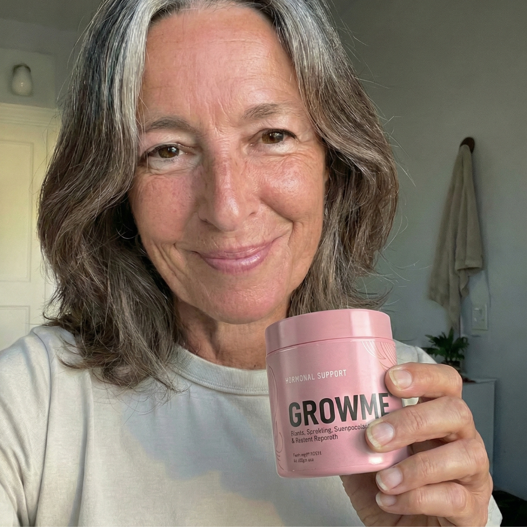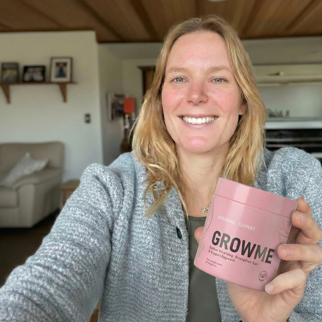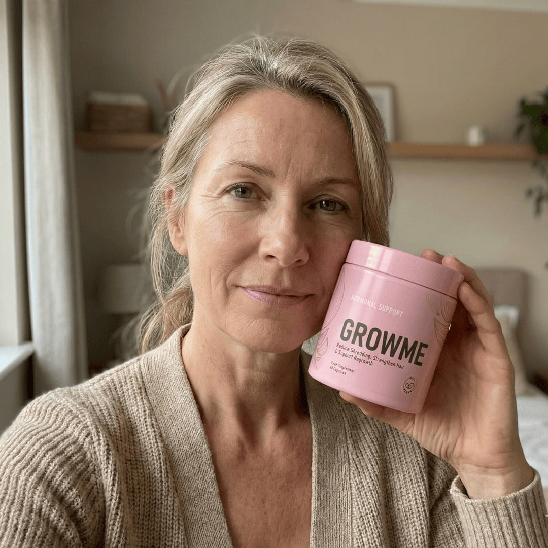 GrowMe works from within to support the hair cycle during hormonal and metabolic change. Key nutrients like biotin, zinc, amino acids and saw palmetto help nourish hair follicles and support normal growth signals. Many women start noticing less shedding and stronger-feeling hair within 6–10 weeks because we’re addressing the internal imbalance, not just masking the problem.